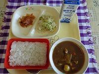 今日の献立は、「麦ごはん 親子風カレー 福神漬け じゃこ入りサラダ 牛乳」でした。