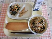 今日の献立は、「はちみつパン きびなごカリカリフライ ほうれん草のサラダ カレーうどん 牛乳」でした。