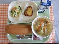 今日の献立は、「コッペパン いちごジャム チキンのオーブン焼き シーザーサラダ 白菜とベーコンのスープ 牛乳」でした。