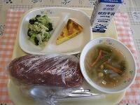 今日の献立は、「ココア揚げパン かぼちゃ入りスペイン風オムレツ グリーンサラダ コーンスープ 牛乳」でした。