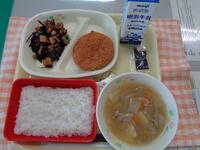 今日の献立は、「ごはん ハムカツ ひじきと大豆の炒め煮 根菜のごま汁 牛乳」でした。