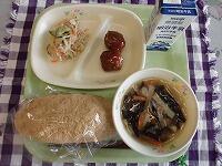 今日の献立は、「きなこ揚げパン 野菜肉団子 もやしとツナのサラダ 春雨のスープ 牛乳」でした。