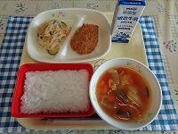 今日の献立は、「ごはん かつおフライ 春雨サラダ ビルマ汁 牛乳」でした。