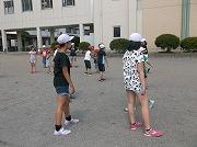 6年生がじょうろに入れた水でドッジボールのラインを引いたり、6年生を先頭にして