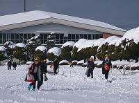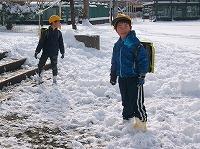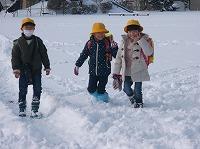 雪の中を、自由気ままに歩いてくる子どもたち…