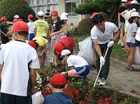 6年生の緑化委員会の児童が 雑草の袋を集めたり、まいた肥料を土地と混ぜたりして