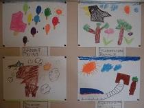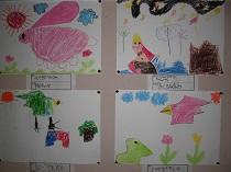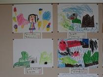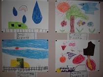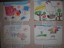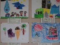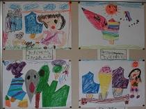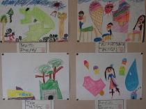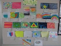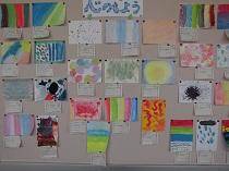 1年生は図画工作科で「いろいろなかたちのかみから」を描きました。紙の形をいろいろな向きから見て、表現したいことを見つけ、絵に表しました。