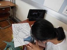 図画工作科で学校の周りの風景を描くのに、6年生はタブレットで撮影した画像をもとに下絵を描きました。