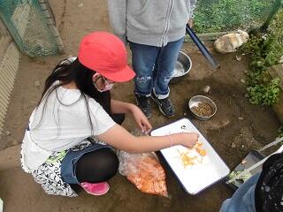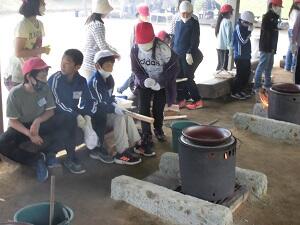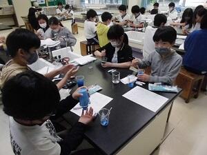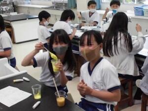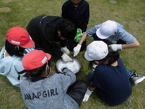 担当の先生から作り方の説明を聞き、子どもたちはグループごとに準備に取り掛かりました。準備が完了すると全員で屋外に出て、巨大シャボン玉作りにチャレンジしました。なかなか思うように巨大なシャボン玉ができませんでしたが、それでも時おり大きなシャボン玉の形がもう少しできそうになるグループもありました。