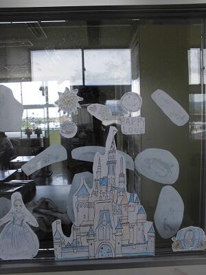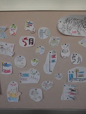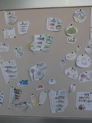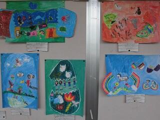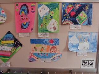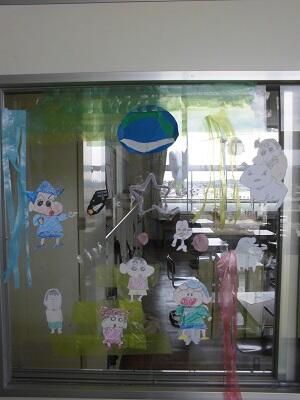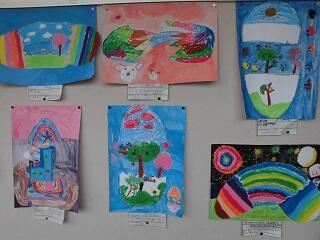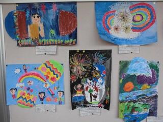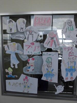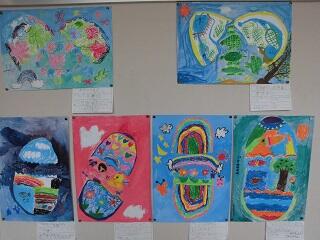 集まった絵をテーマごとに分けて、5年教室廊下側の壁面や窓に飾りました。どのコーナーもきれいに飾り付けられ、そこを歩くだけで“ホッとする”ような、癒しの空間になりました。