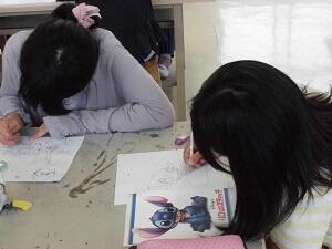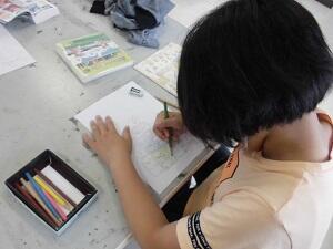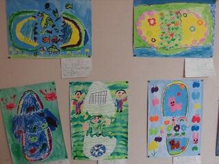 5年生が、図画工作で壁面に飾る絵を描きました。テーマをもとにして想像力を働かせて、一人一人が自分の好きな絵を描きました。
