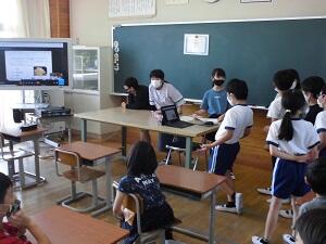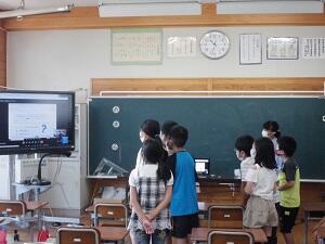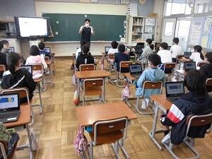昼休みの時間を使って、6年生が「県民の日集会」の準備に取り組んでいます。この日は、リハーサルということで、6年生一人一人が自分のタブレットに映し出された“代表児童が進行する様子”を視聴しました。