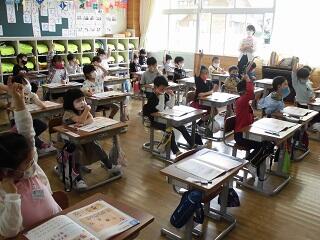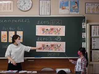 「なんばんめかかんがえよう(何番目か考えよう)」というめあてで、授業が進められました。まず教科書の挿絵を見て、先生が指示した内容に当てはまる動物が何になるのかを考えました。