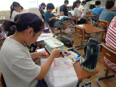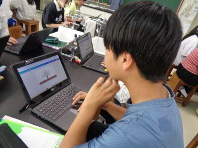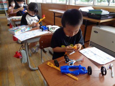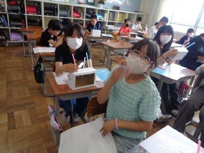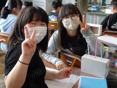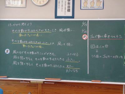 3年理科授業の様子。前回の実験結果から「考えられること」をまとめていました。その後は、「動く車」の製作に取り組みました。