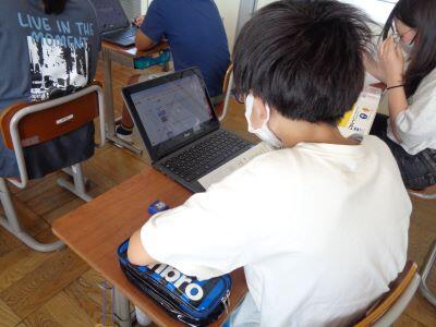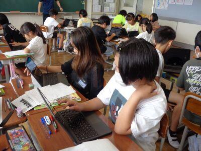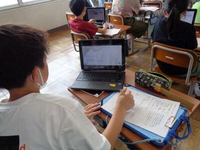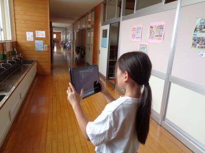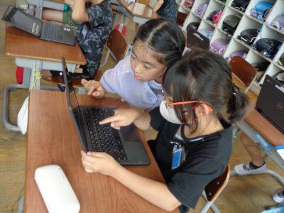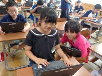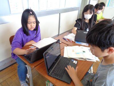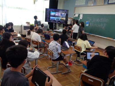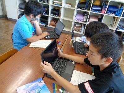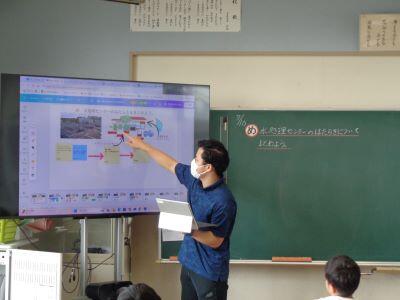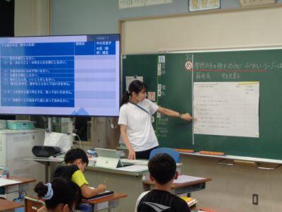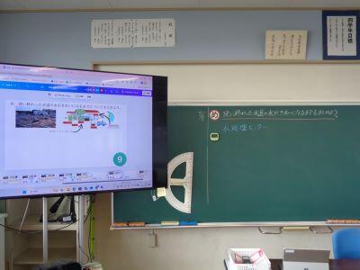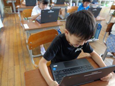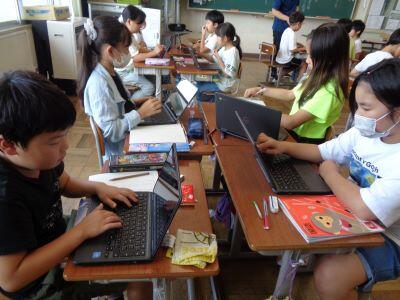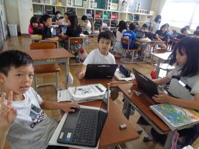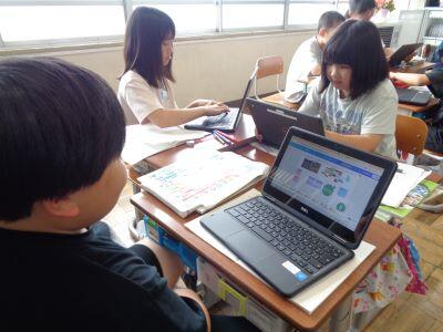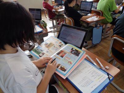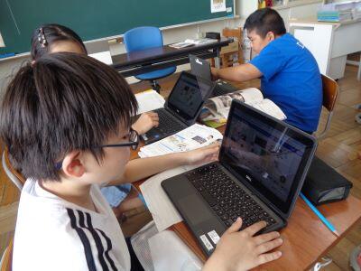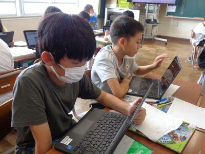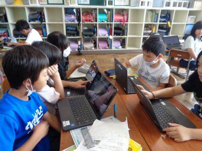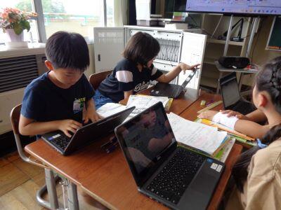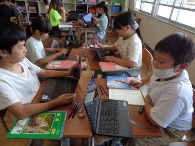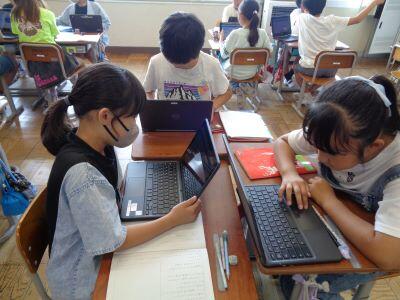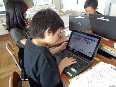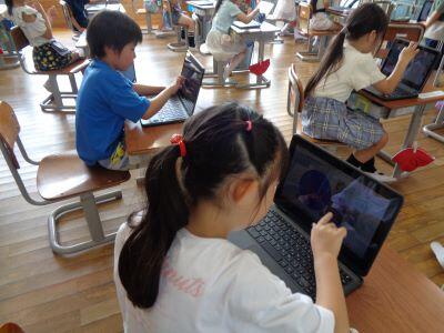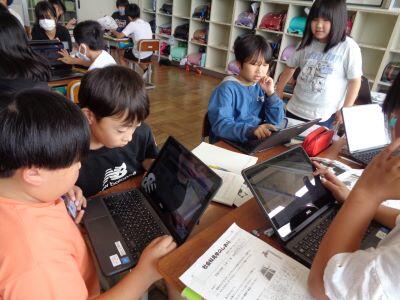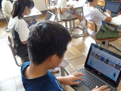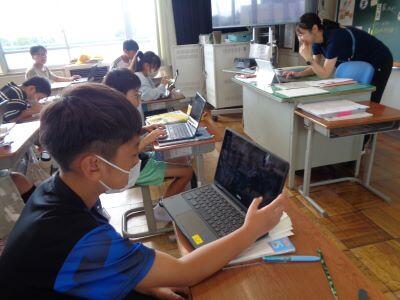 4年生の授業の様子。1組では、タブレット端末を使った社会科校外学習のまとめが行われていました。