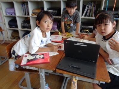 担任の先生が、中学校時代の恩師から譲り受けたという歴史人物肖像画を使って授業をしています。調べ学習では、子どもたちが自分のペースで楽しく取り組んでいますキラキラ