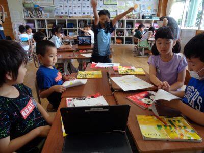 4年国語授業の様子。「思わず読みたくなるような本のポップや帯を作ろう」というめあてのもと、子どもたちは意欲的に取り組みました。