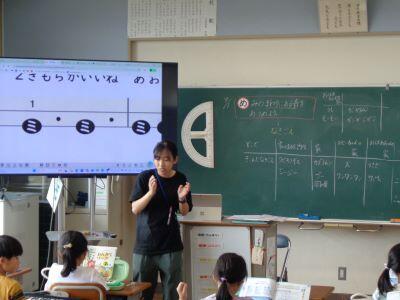 先生が流す楽曲に合わせて、大きな声で歌ったりリズムをとって演奏したり…。楽しく、一生懸命に学ぶ姿が見られましたにっこり