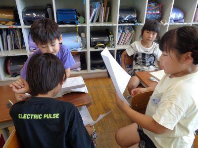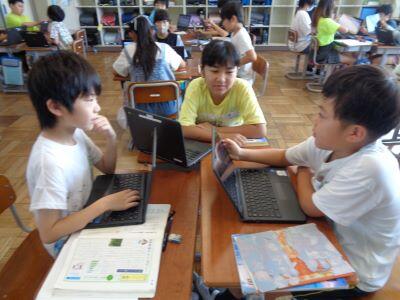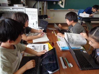 2組では、国語科授業で新聞づくりの話合いがグループごとに行われていました。
