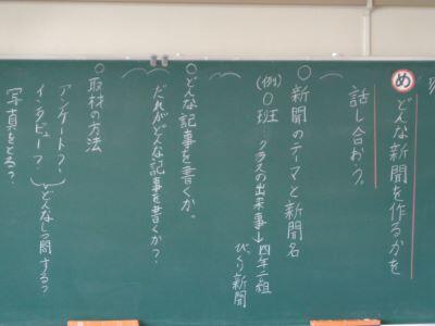 4年国語授業の様子。1組・2組ともに、「新聞づくり」に取り組んでいます。割り付けの基本を学んだり、紙面構成の具体的な設定を体験したりしながら、一人一人の集中力が高まっている様子ですキラキラ