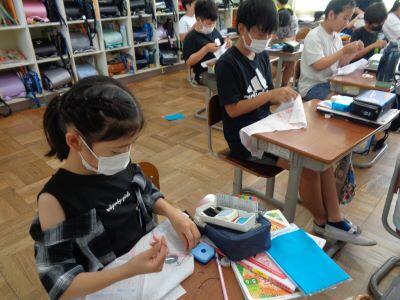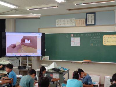 1組は家庭科で、小物づくりに取り組んでいました。本時は"何をつくるか"というめあてで、一人一人が計画を立てまとーした。
