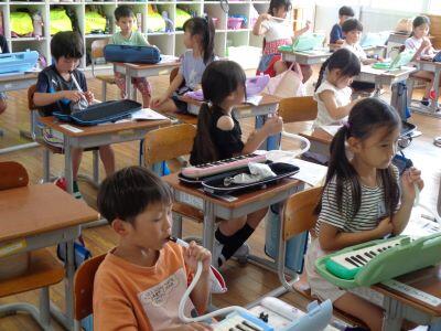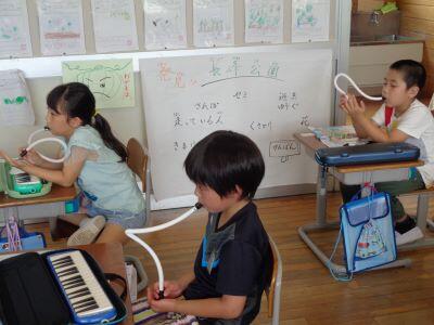 1年生の授業風景。校内を巡視すると、1組は音楽、2組は算数の授業が行われていました。