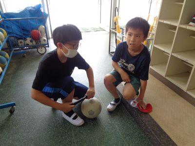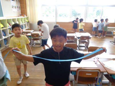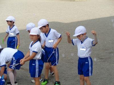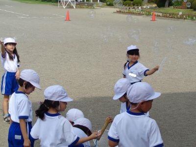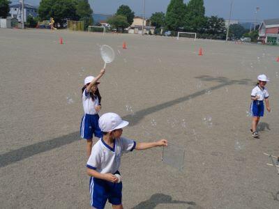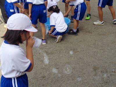 生活科の体験活動で、1年生が楽しそうにシャボン玉を飛ばしていました。自分たちで考えた"道具"を用いて、どんなもので上手にシャボン玉ができるのかを試していましたキラキラ