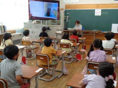 朝の時間帯に、"お話ポットの会"の皆様による読み聞かせが行われました。各教室では、モニターに映し出された"本の挿絵"を凝視し、読み聞かせを楽しむ子どもたちの姿が見られました。