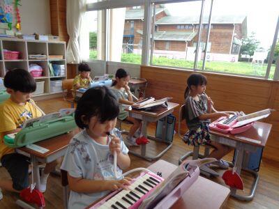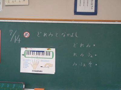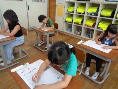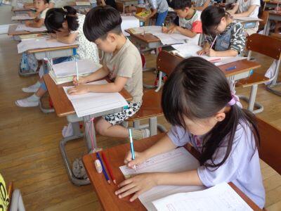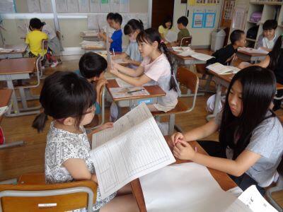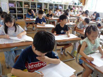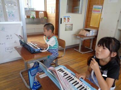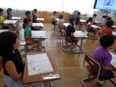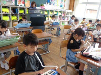 1年生の授業風景。校内を巡視すると、1組は音楽、2組は算数の授業が行われていました。