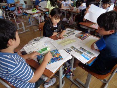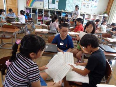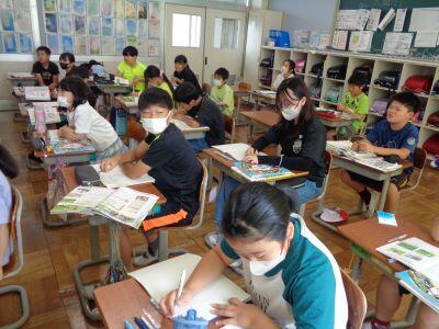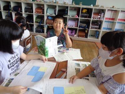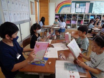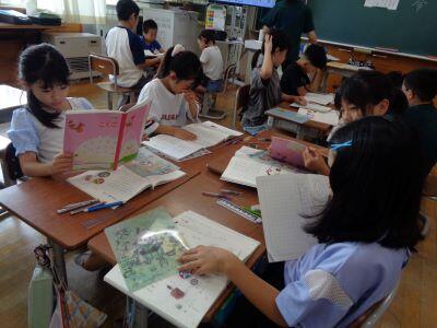 4年国語授業の様子。「思わず読みたくなるような本のポップや帯を作ろう」というめあてのもと、子どもたちは意欲的に取り組みました。
