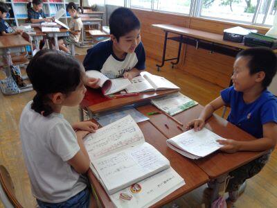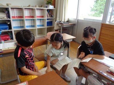 3年国語の授業。友達とペア・グループになって、友達の取組を聞きいたり、自らの考えを伝えたりしています。