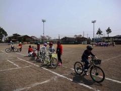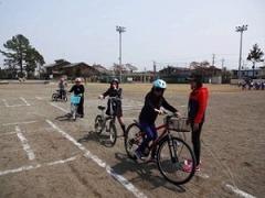 ↓校庭に作られた模擬道路での、自転車乗車練習。交差点は、特に注意して渡りましょう!