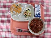 今日の献立は、「ミートソーススパゲティ アーモンドサラダ ホットケーキ 牛乳」でした。