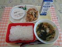 今日の献立は、「ごはん ホイコーロー わかめと卵のスープ 桃 牛乳」でした。
