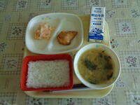 今日の給食は「ごはん 牛乳 チキンカレー ポパイサラダ ヨーグルト」でした。