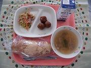 今日の献立は、「食パン りんごジャム コロッケ チーズとコーンのサラダ 白菜のスープ 牛乳」でした。