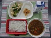 今日の献立は、「ごはん ポークカレー 福神漬け 花野菜とパスタのサラダ 牛乳」でした。