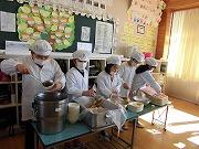 すいとんは、昔、食べものがなかった時代によく食べられた、昔から作り伝えられている郷土料理の一つです。給食では、小麦粉に牛乳を加えて練って作った生地を、肉や野菜がたっぷり入った栄養満点の汁の中に入れて作りました。