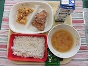 今日の献立は、「ごはん 鶏のから揚げ しもつかれ えのきのみそ汁 ふりかけ 牛乳」でした。