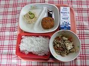 今日の献立は、「ごはん 豆腐野菜ハンバーグ ポテトサラダ かんぴょうのみそ汁 牛乳」でした。