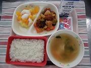今日の献立は、「ごはん 酢豚 餃子スープ ふりかけ フルーツ杏仁 牛乳」でした。