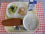 今日の献立は、「黒コッペパン はちみつチキン こんにゃくサラダ ベーコンチャウダー 牛乳」でした。