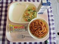 今日の献立は、「ミートソーススパゲティ イタリアンサラダ 米粉ドック 牛乳」でした。