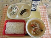 今日の献立は、「ごはん ぶりの西京焼き 根菜サラダ きりたんぽ汁 牛乳」でした。