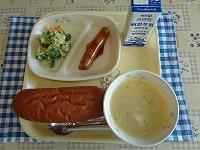 今日の献立は、「黒糖パン フランクフルト ブロッコリーサラダ コーンポタージュ 牛乳」でした。