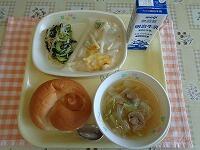 今日の献立は、「米粉パン マカロニグラタン 小松菜入りじゃこサラダ コンソメスープ 牛乳」でした。