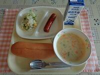 今日の献立は、「ホットドック コールスローサラダ 豆のポタージュ 牛乳」でした。