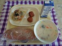 今日の献立は、「キャラメル揚げパン 肉団子 カムカム海藻サラダ ニョッキのクリームスープ 牛乳」でした。