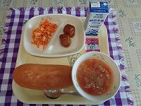 今日の献立は、「コッペパン マーシャルビーンズ 甘酢肉団子 にんじんシリシリ 夏野菜のミネストローネ 牛乳」でした。