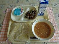 今日の献立は、「ジャージャー麺 ひじきのナムル ラムネゼリー 牛乳」でした。
